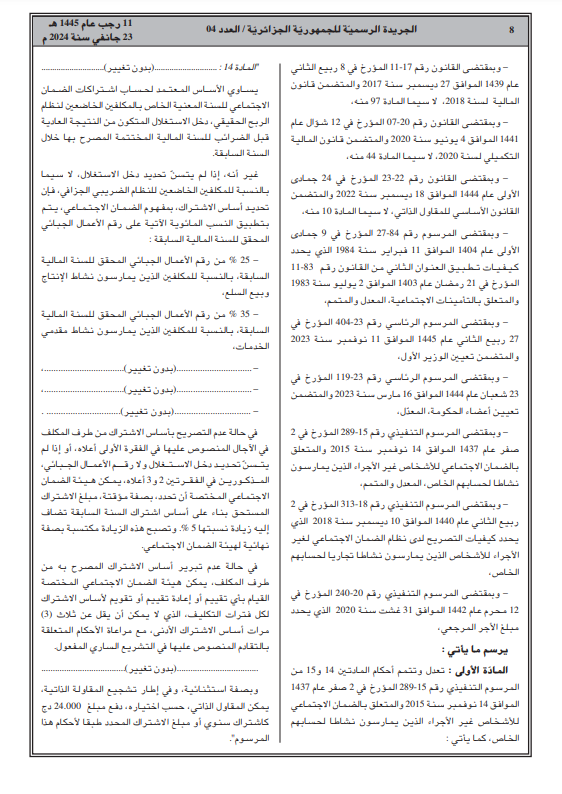 نُشر مرسوم تنفيذي رقم 24-49 مؤرخ في 13 جانفي 2024، يعدل ويتمم المرسوم التنفيذي رقم 15-289 ، بالجريدة الرسمية، ويتعلق بالضمان الاجتماعي للأشخاص غير الأجراء الذين يمارسون نشاطا لحسابهم الخاص.